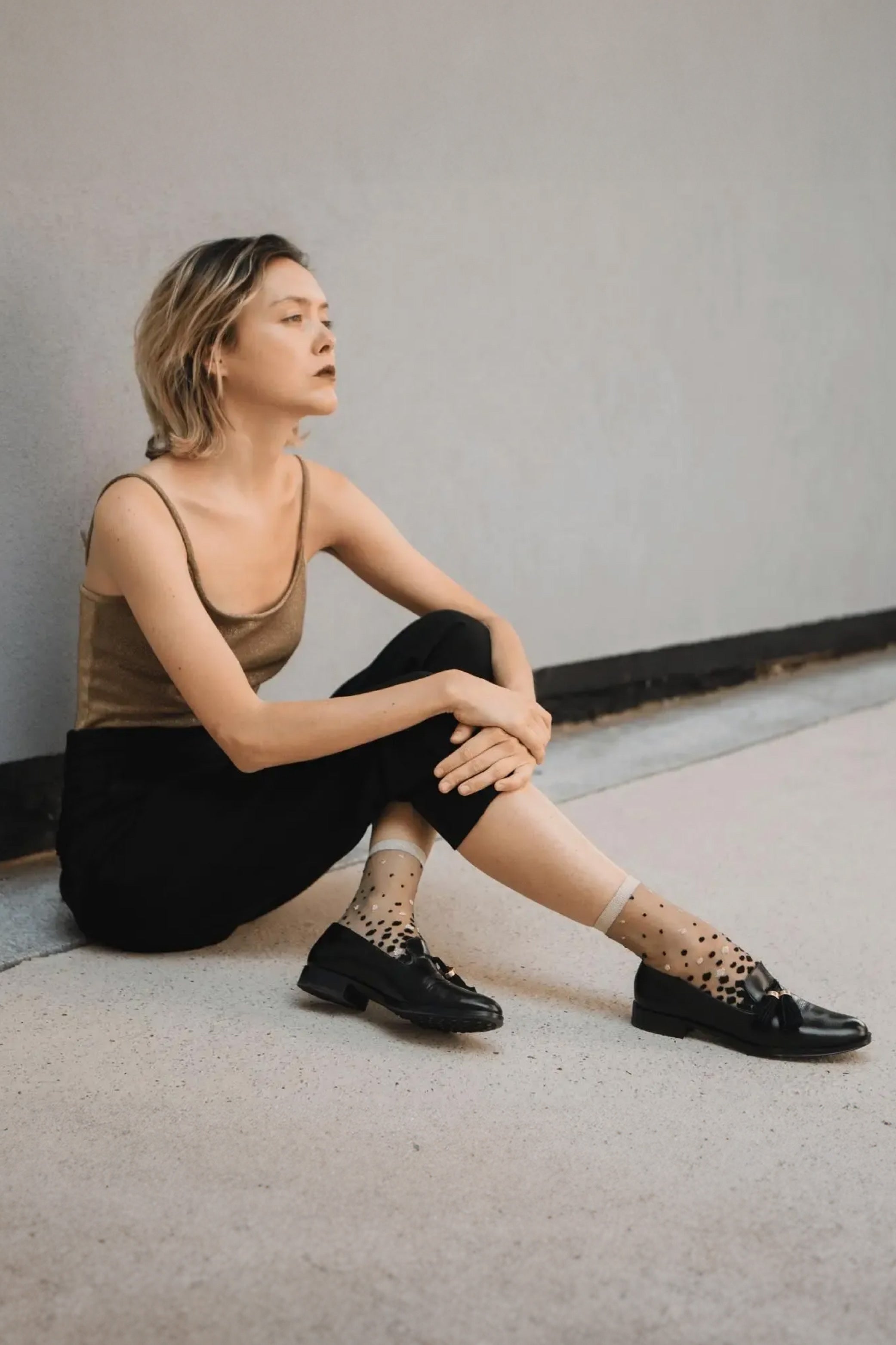 A gradient of black and gold polka dots on a transparent background: a classic plumetis revisited. Perfect with both derbies and loafers! Inspired by the flight of cherry blossom petals on the Nakameguro Canal.