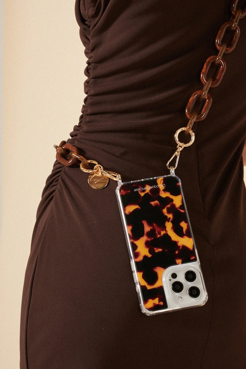 Milena phone chain in brown resin, 120 cm long, clips onto our ring cases or our universal adapter with its rotating carabiners. Its plus points? Its engraved LCF medal, its shades of brown.