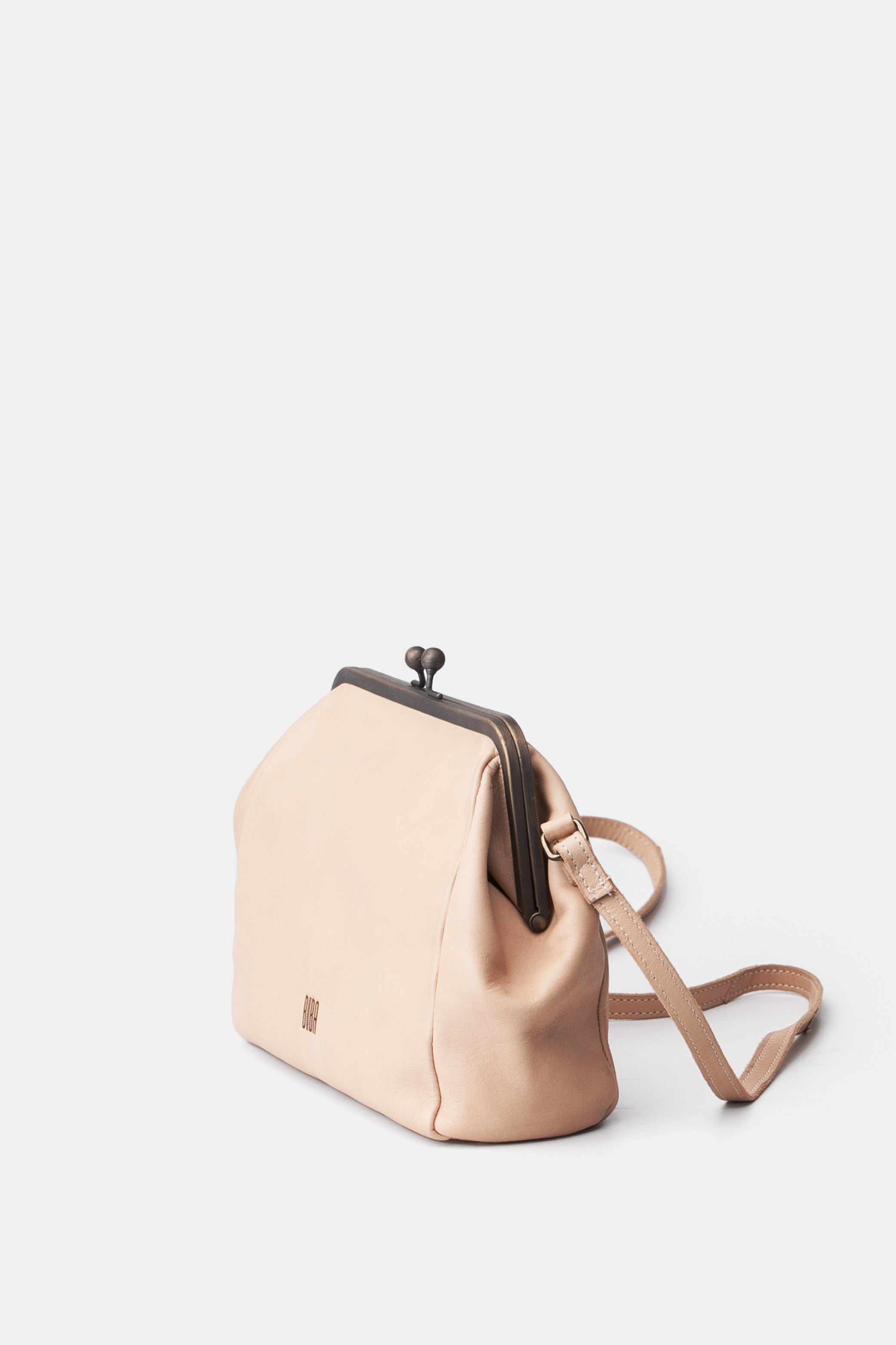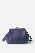 Washed and vegetable-tanned cowhide leather cross bag. Frame closure, adjustable shoulder strap, internal pockets, and cotton lining.