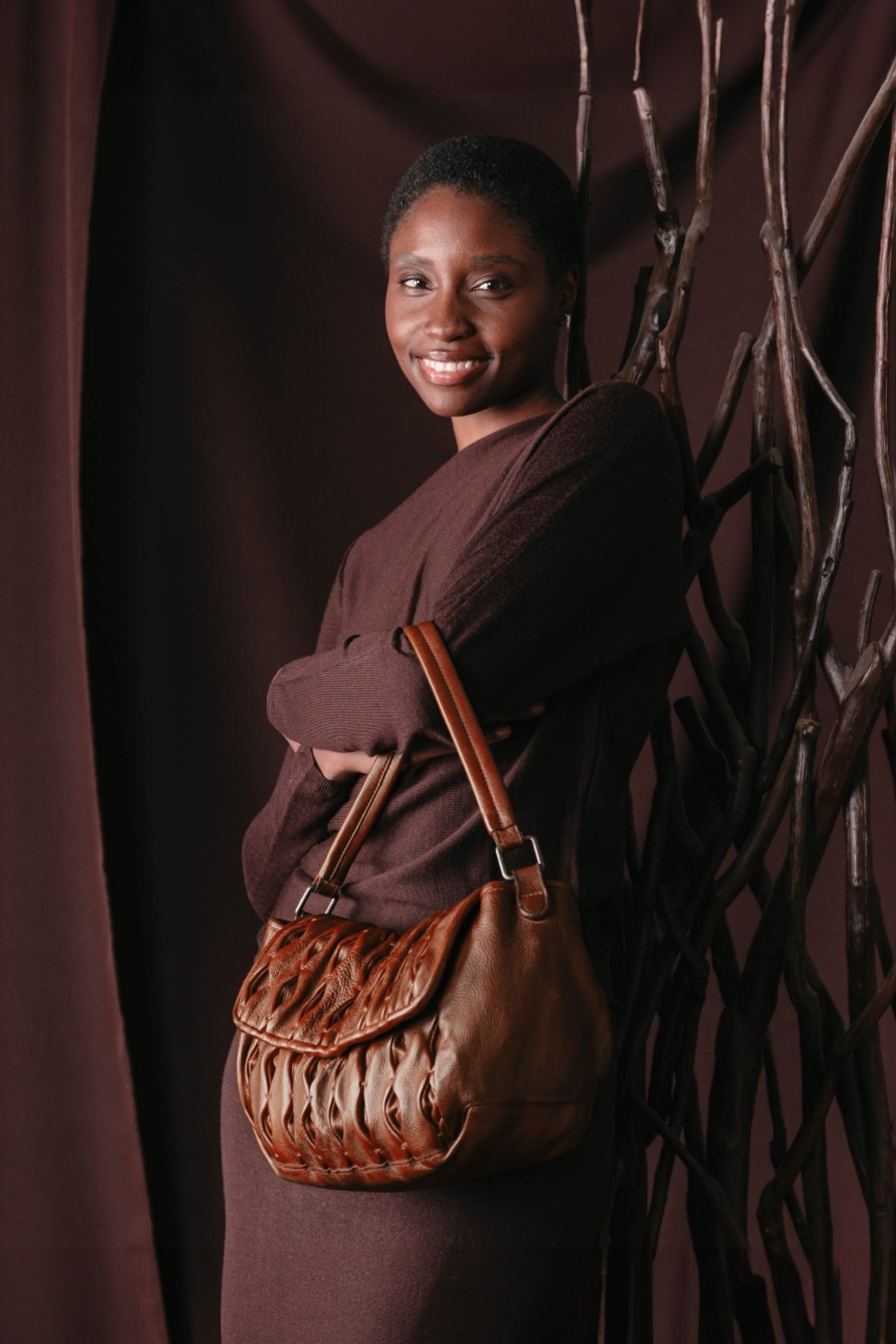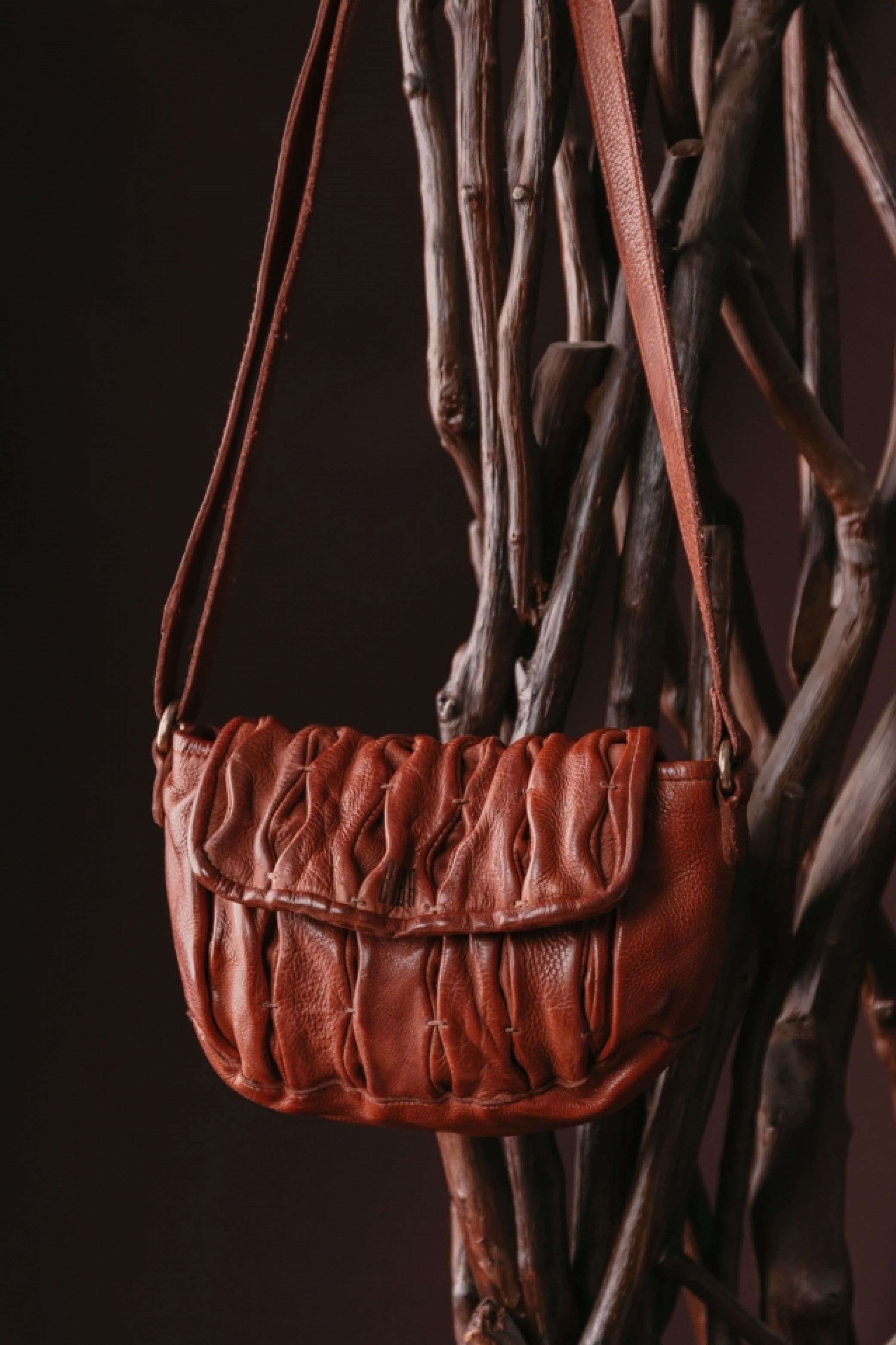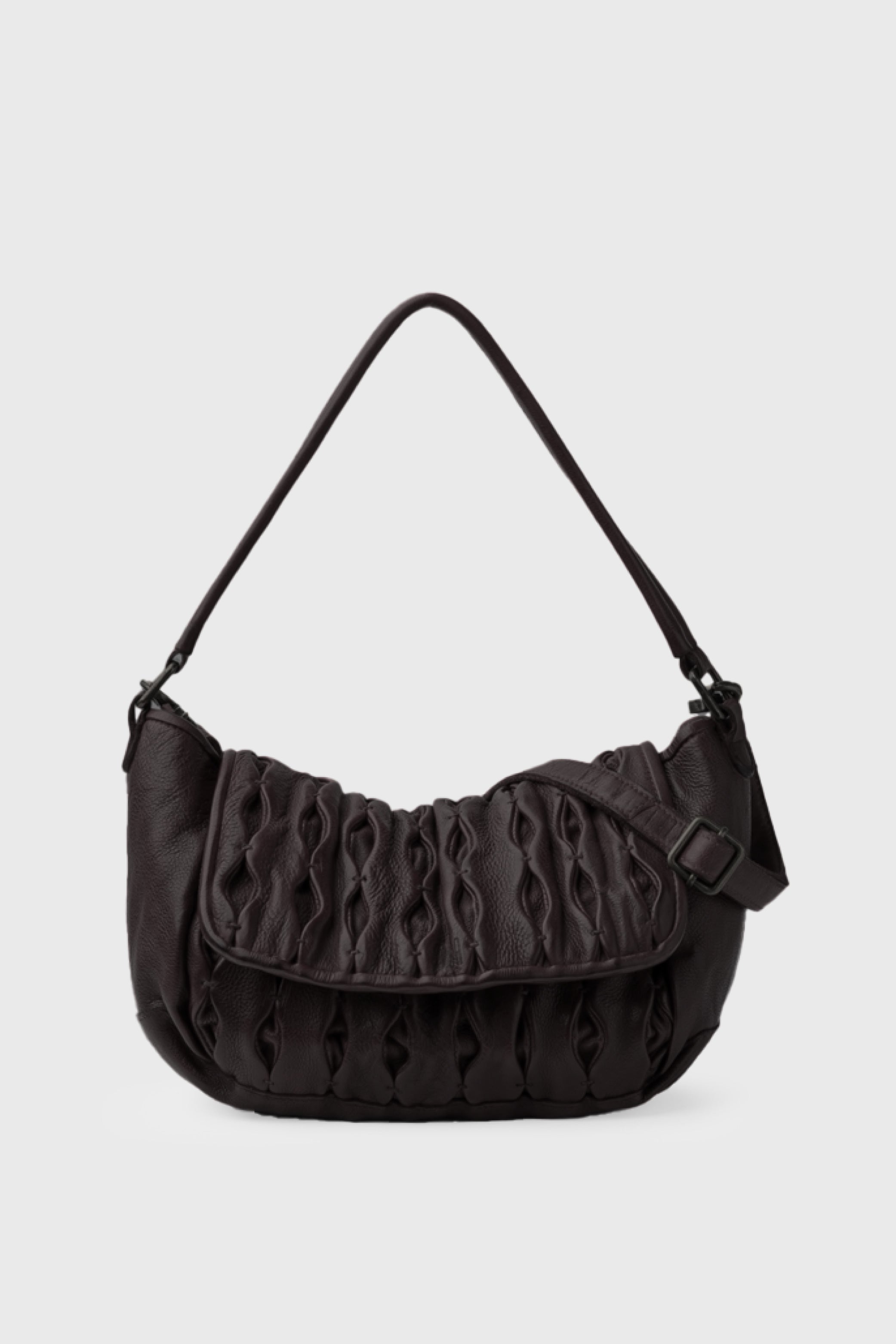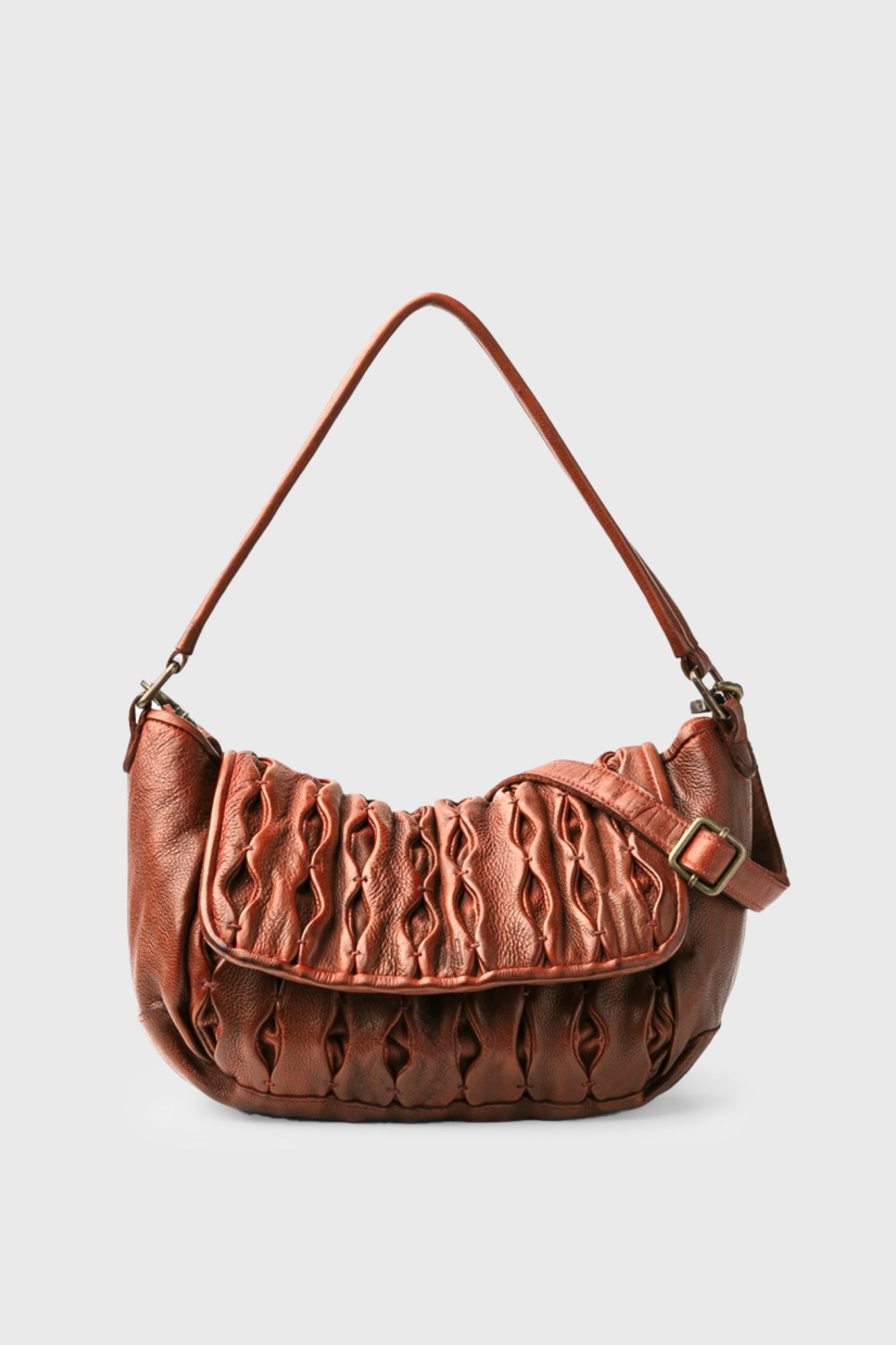 Washed cowhide medium bag. The leather folds on the flap and front of the bag stand out. Shoulder strap and adjustable and removable shoulder strap. Zip closure. Side button for adjustment. External and internal pockets. Cotton lining.