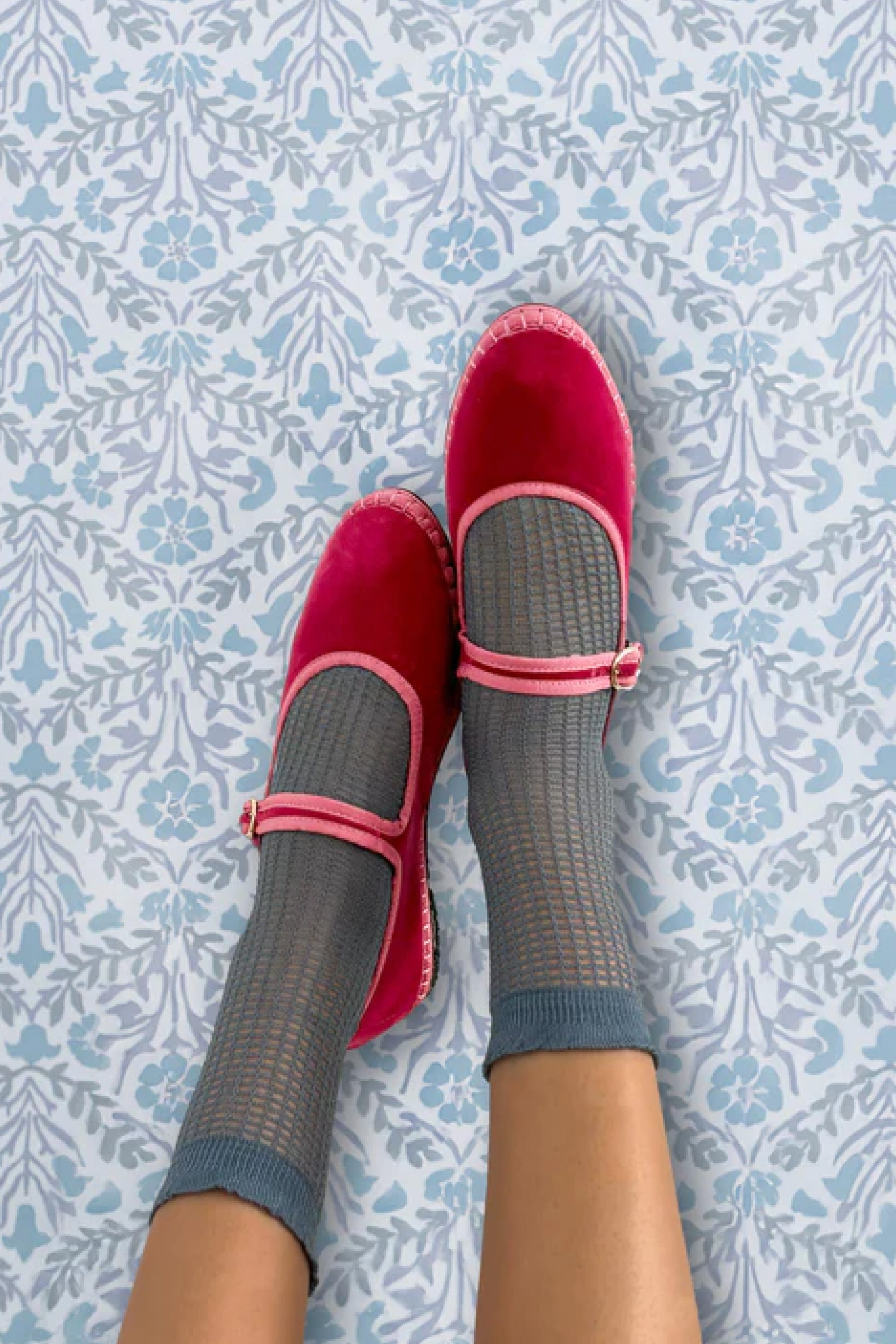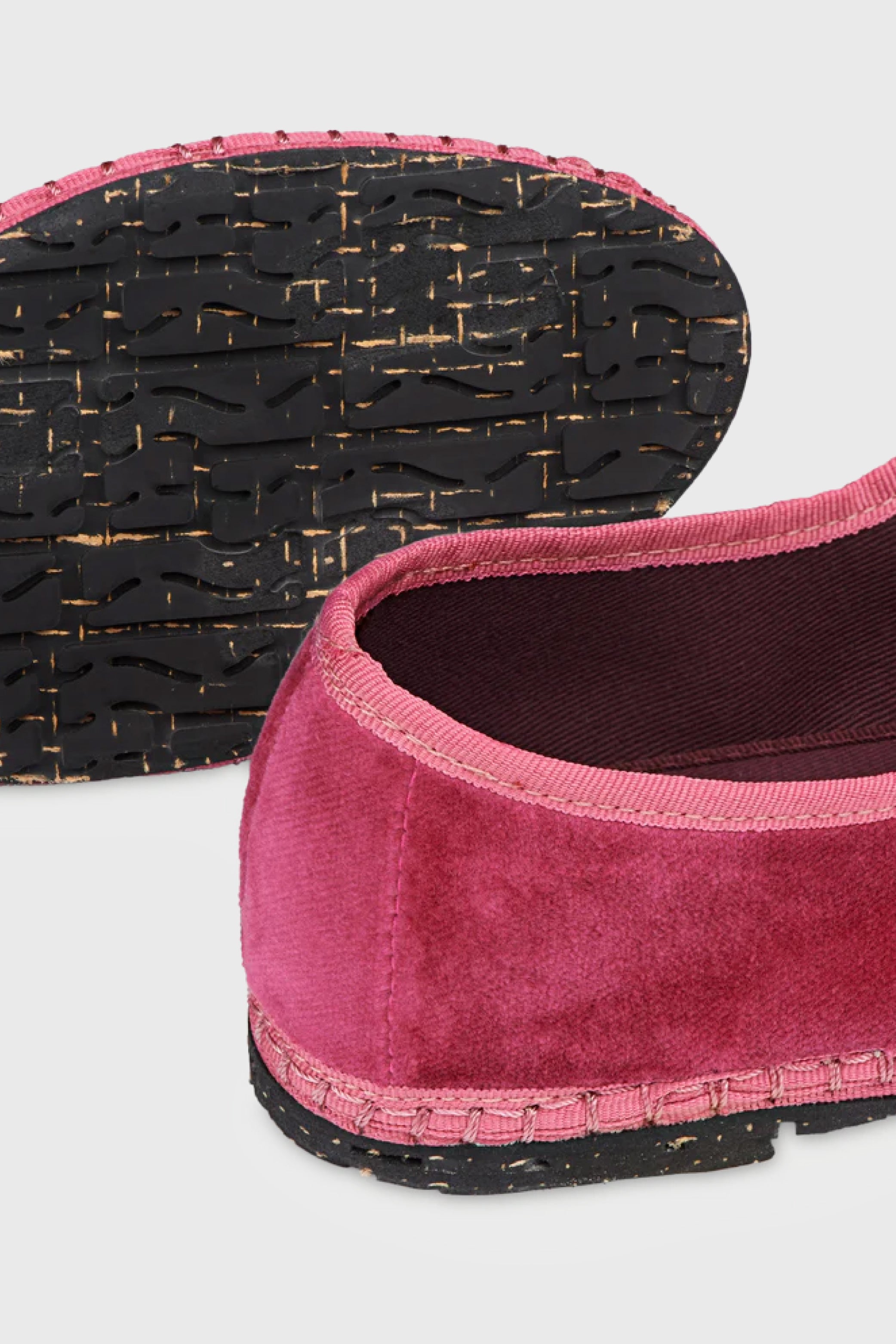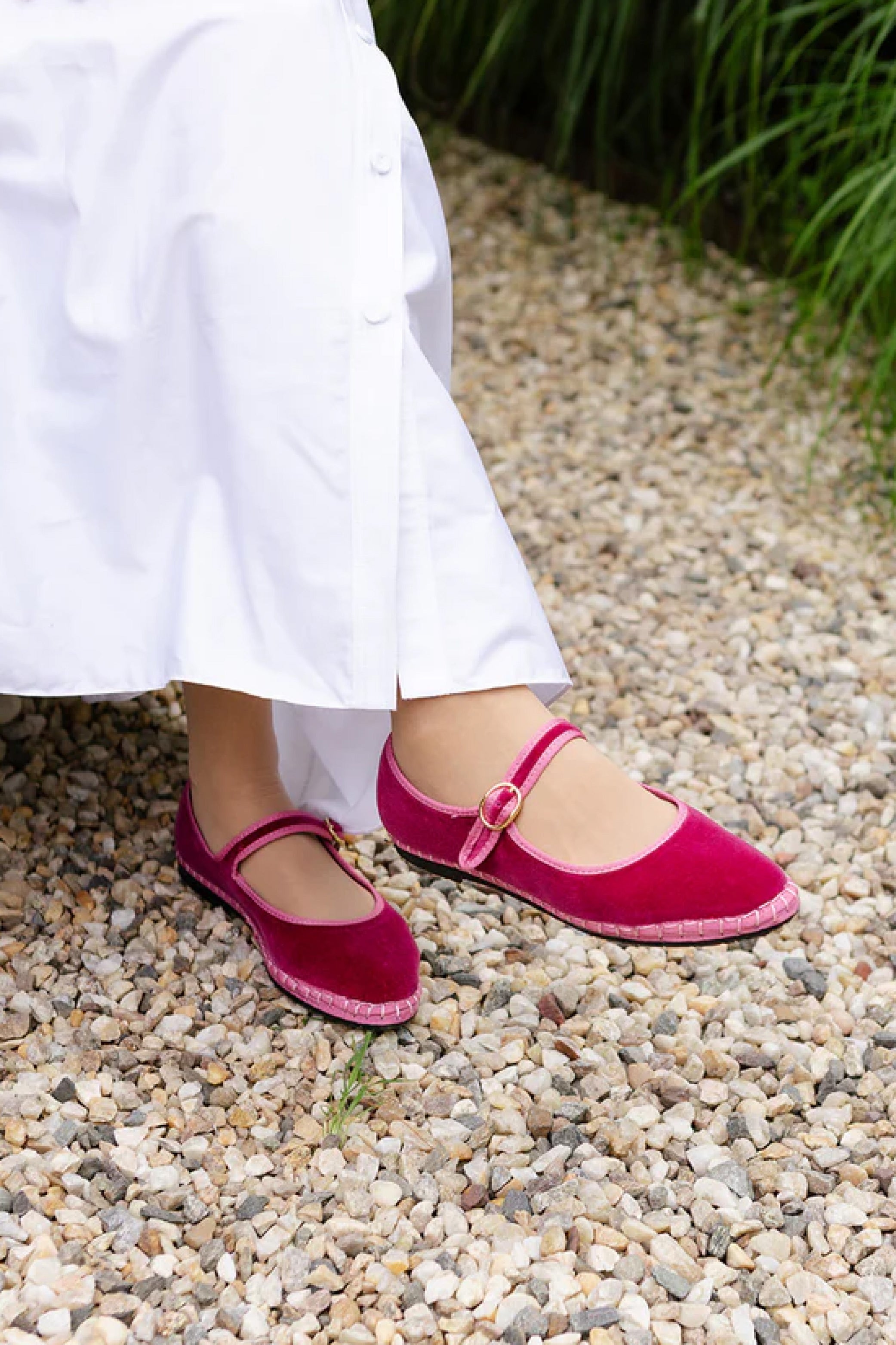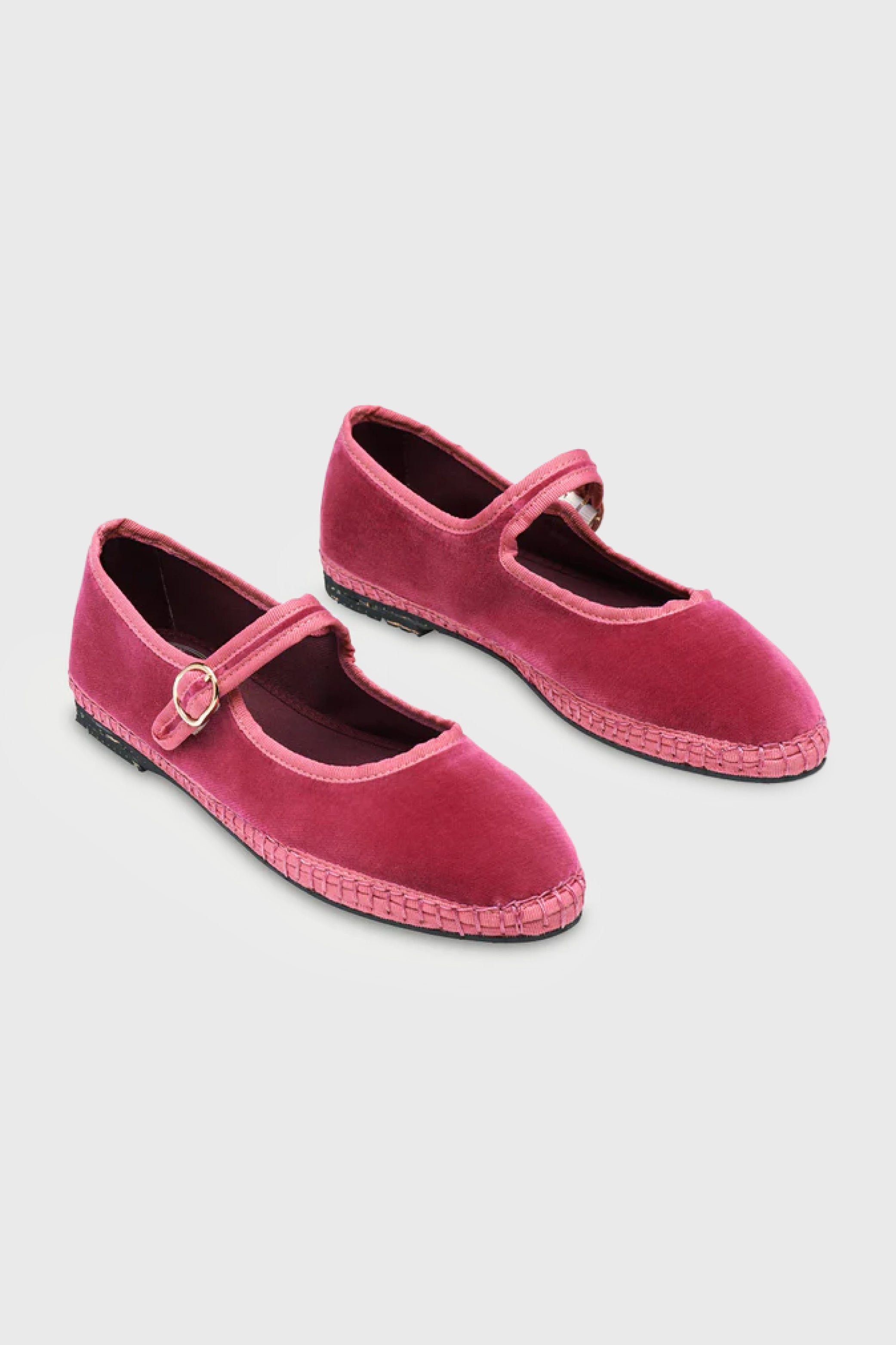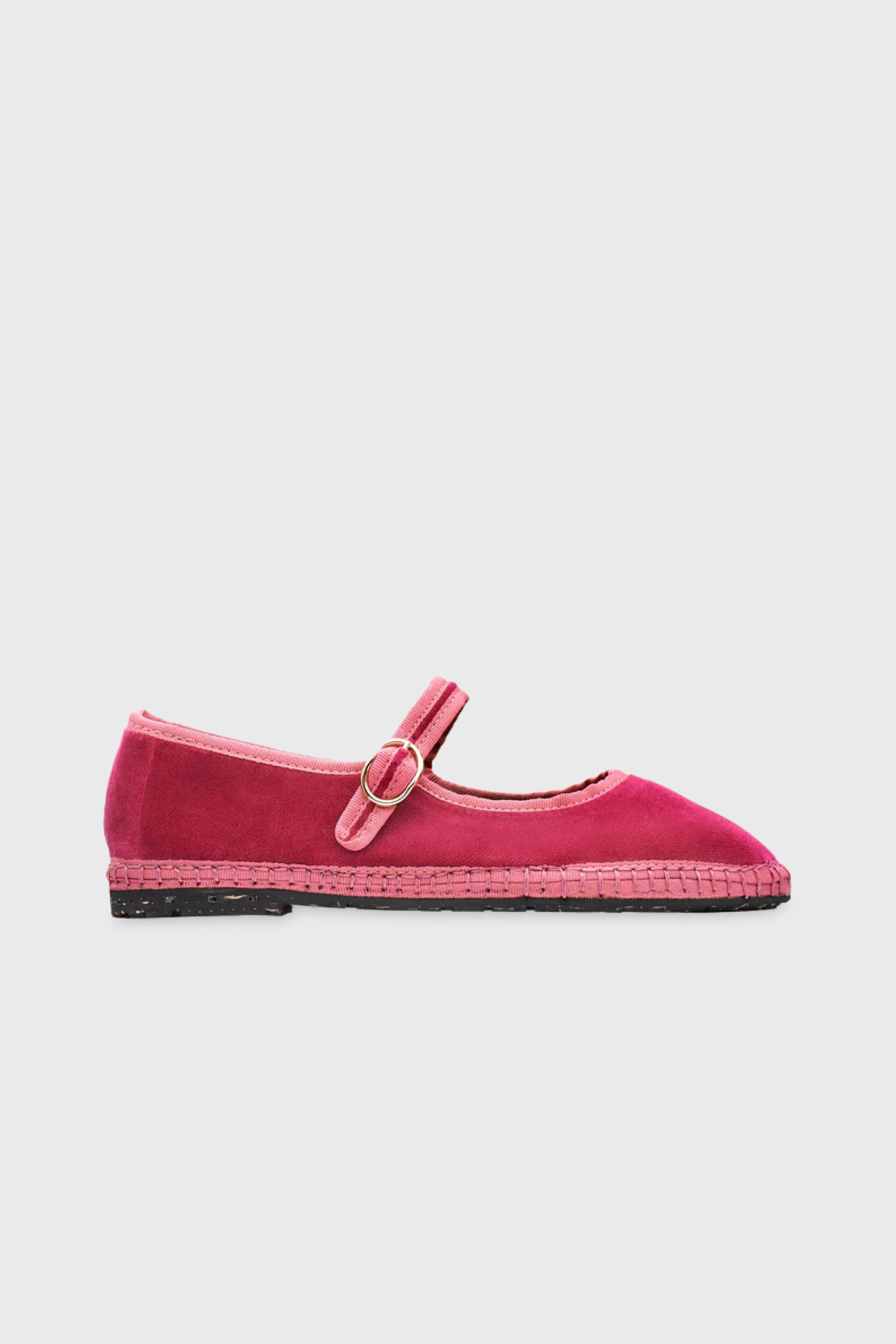 - Velvet mary jane in pink with pink piping and buckle closure.