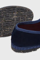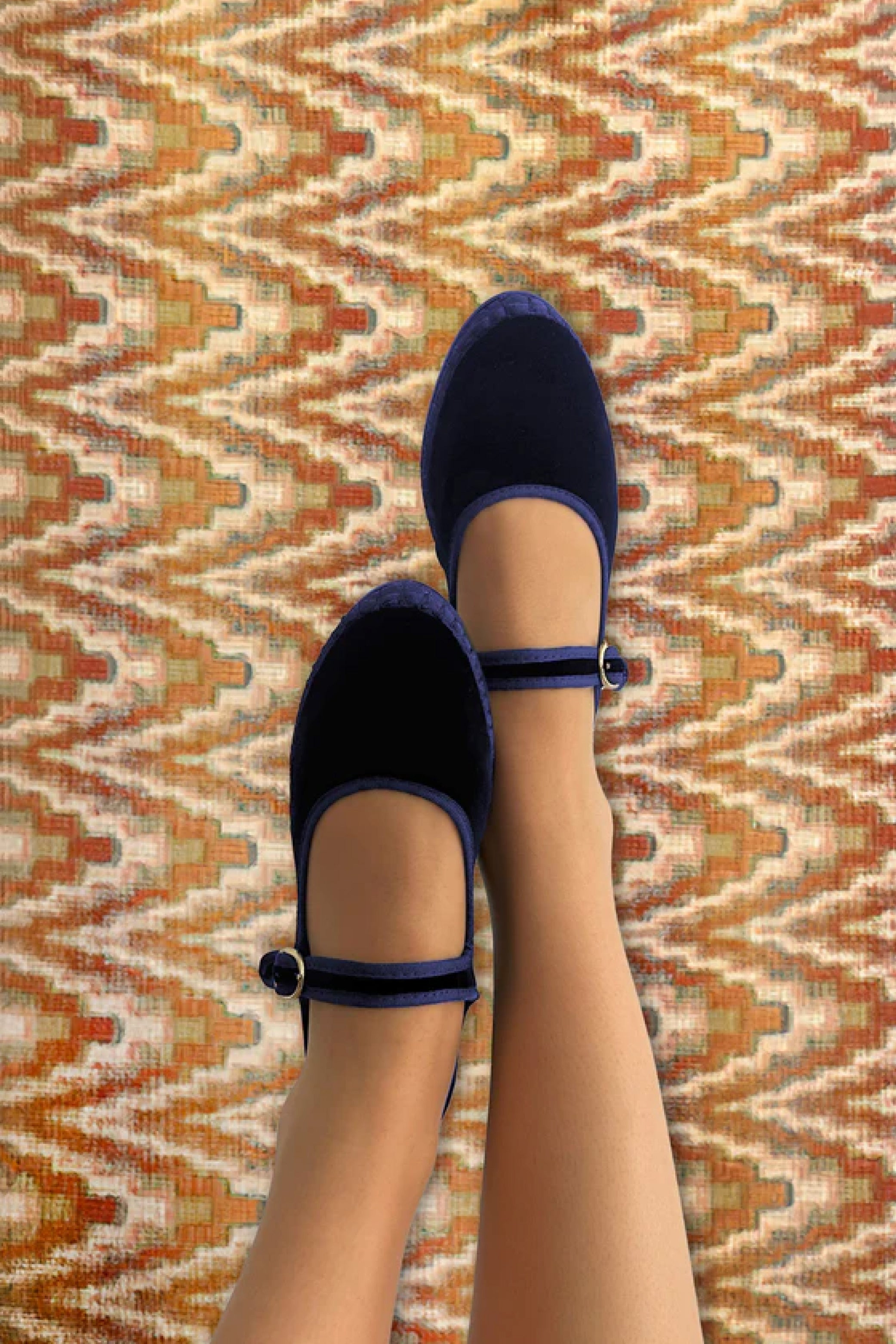 - Velvet mary jane in dark blue with dark blue piping and buckle closure.