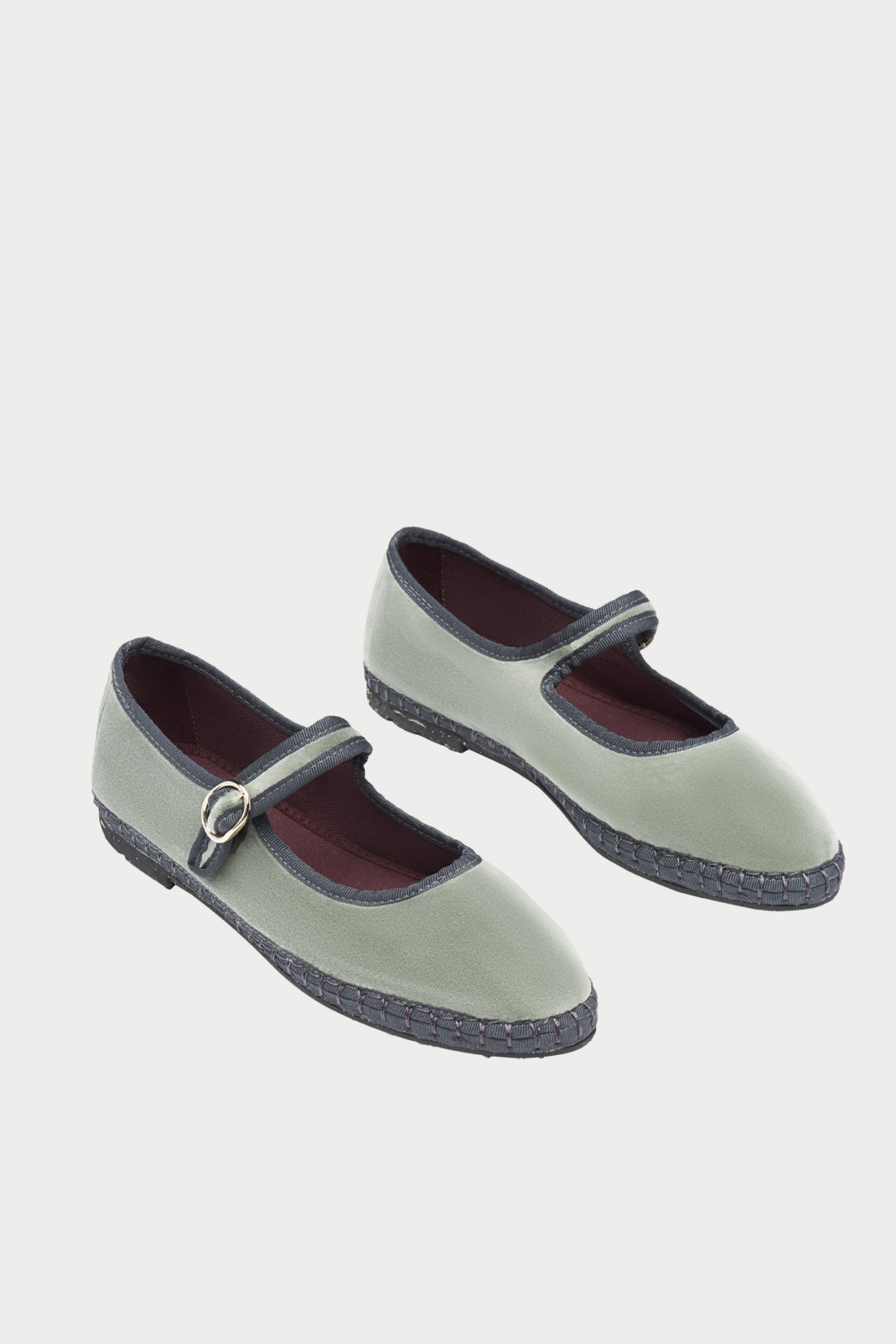- Velvet mary jane in light green with light grey piping and buckle closure.
