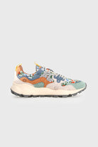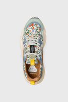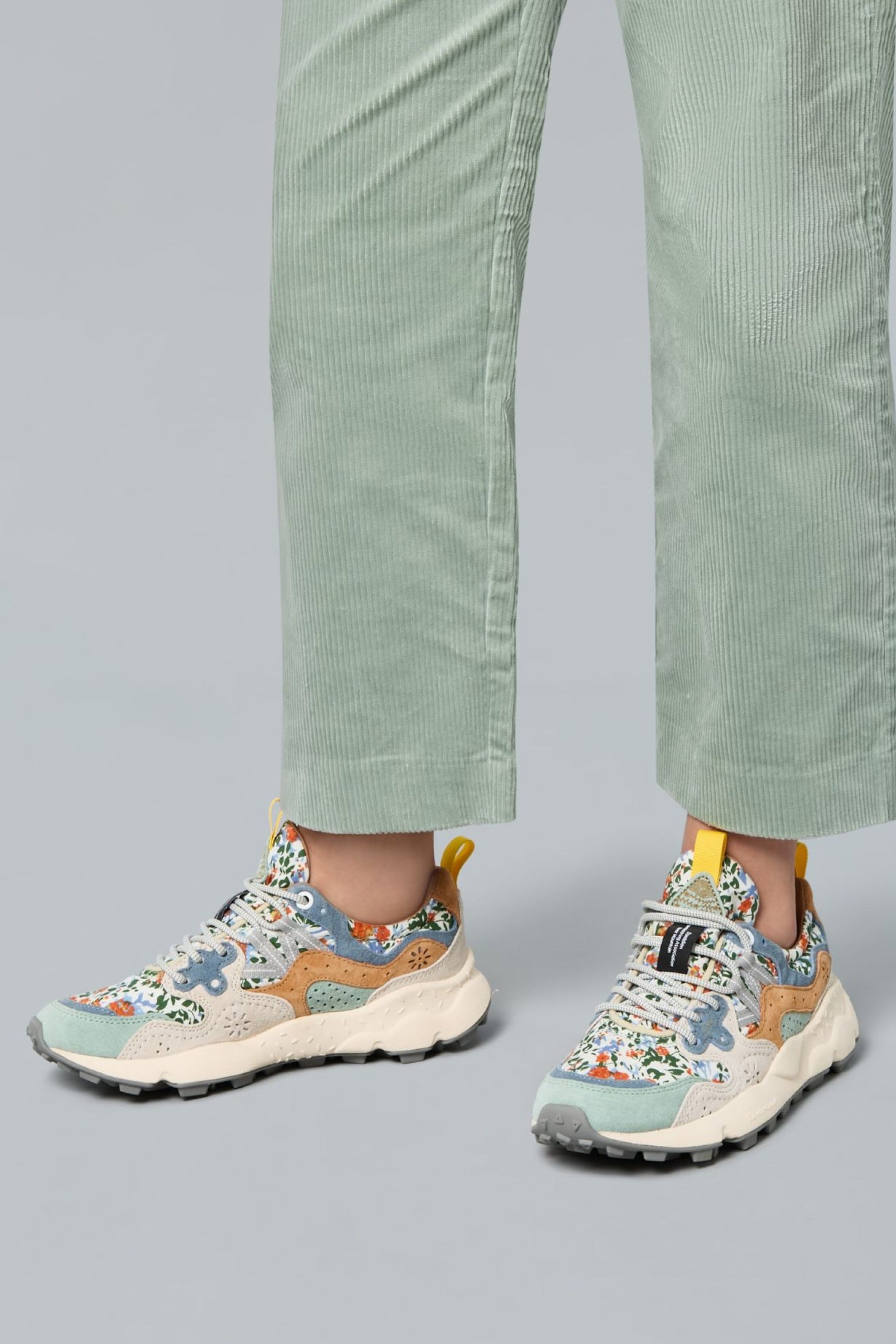 Sneakers with technical fabric upper with a floral print, with multicolour suede inserts. Closure with trekking laces and custom shaped eyelet. Antibacterial natural cork leather lining and insole. Moulded, ultra-light rubber sole with indented tread.