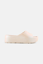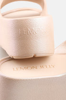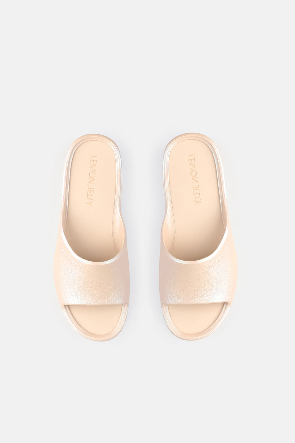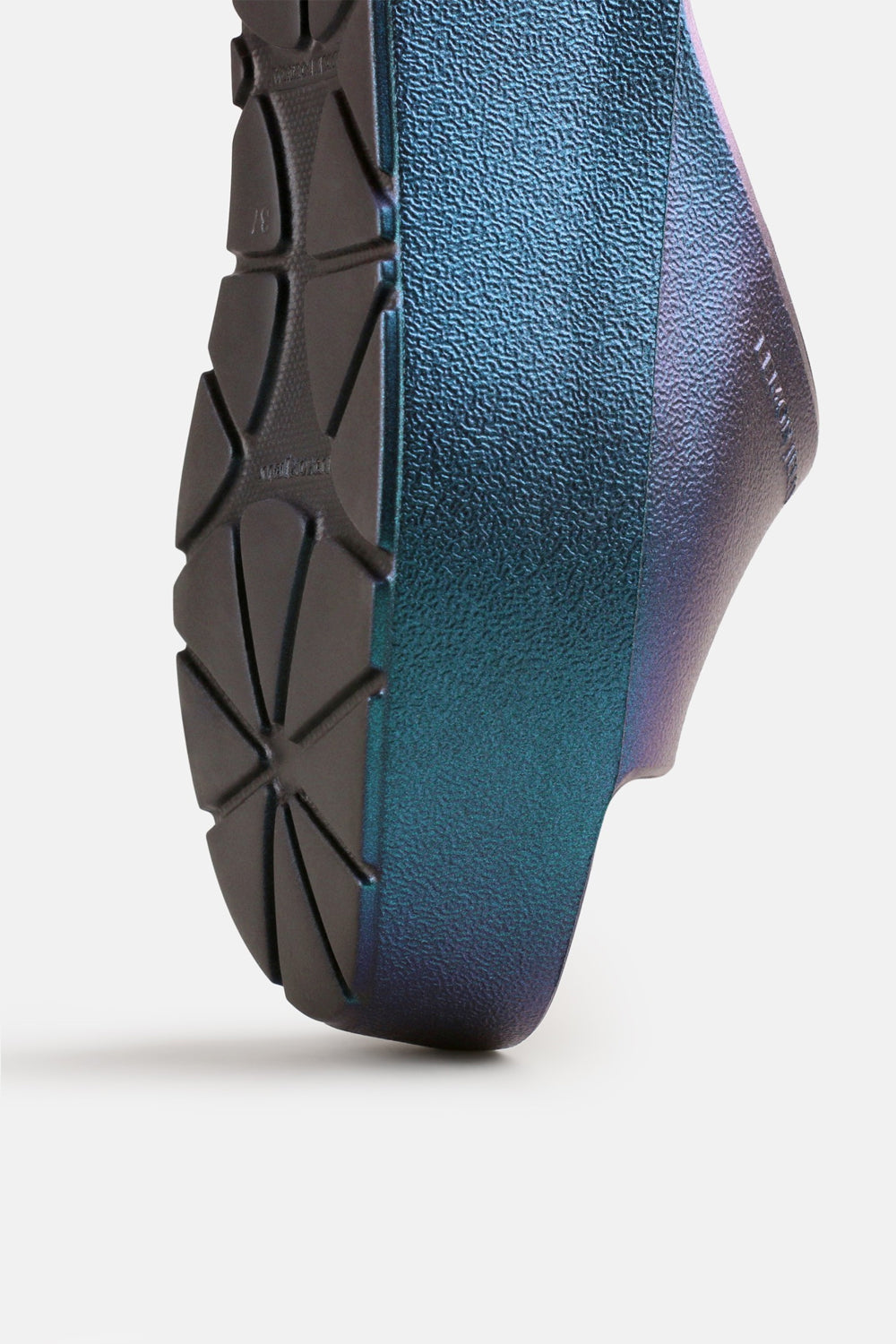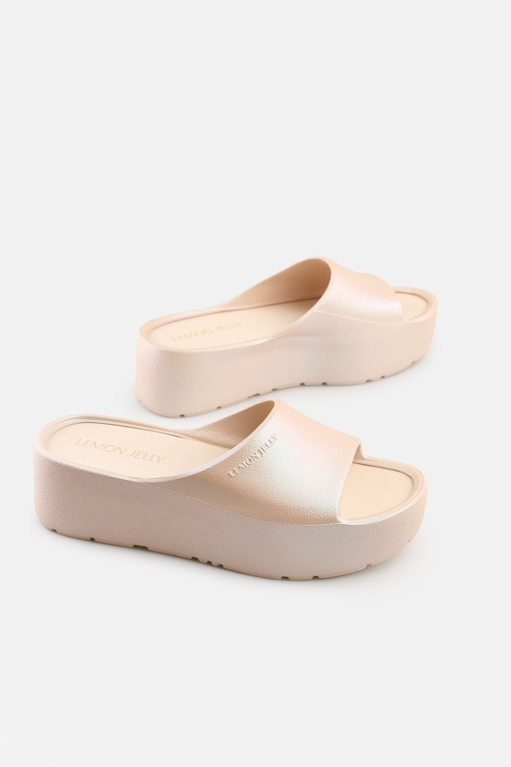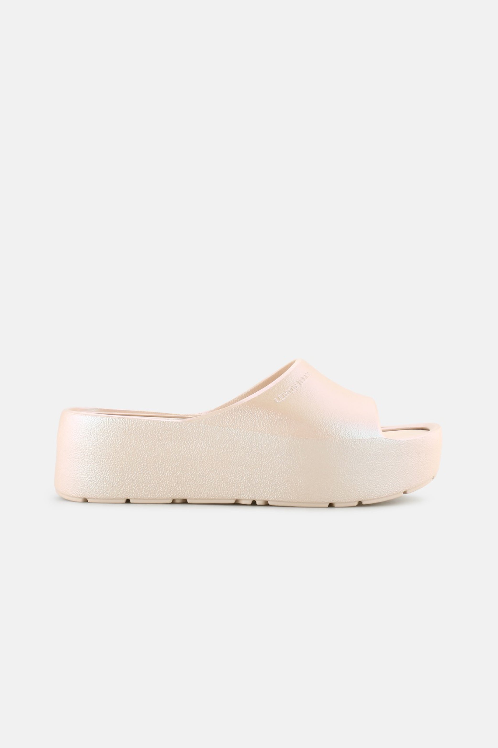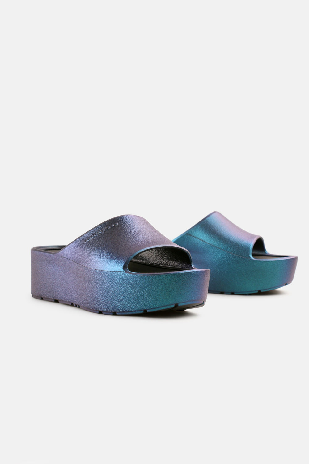 The sun shines high and glows from your feet with the glistening effect coming from your platform slides. What a relaxing way to enjoy your summer break with a comfortable pair of slides. Perfect for beachside trolls and long party nights, with dresses or shorts, inviting the warm winds to mark its presence in your days. An elegant shape designed and produced in Portugal, in a factory that operates under sustainable practices.