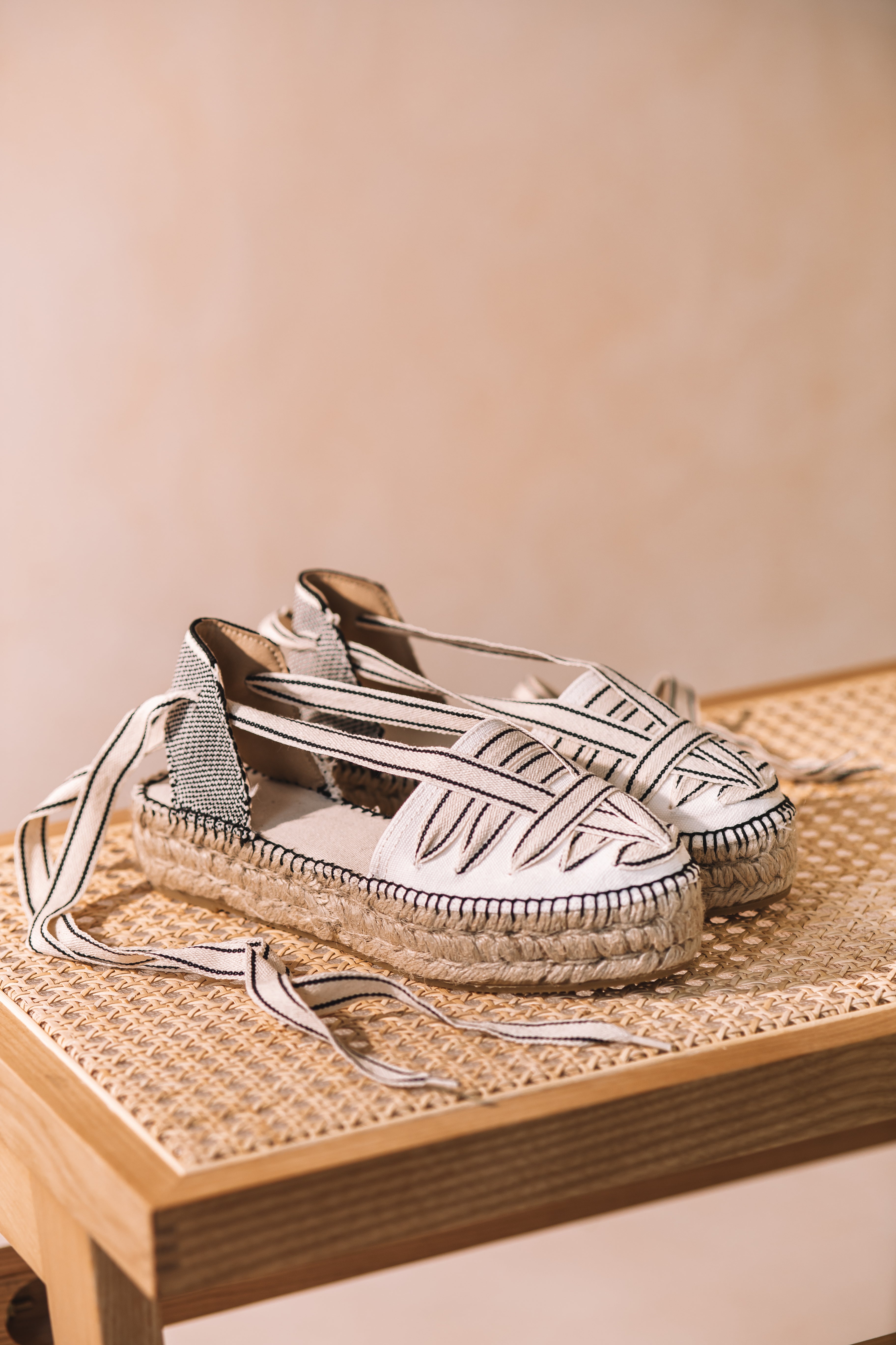 LIONETTE. This women’s espadrille with crossed straps is part of the Toni Pons & Sita Murt capsule collection. It is made from cotton fabric and features a closed-toe design that adjusts with two-tone ribbons. The jute sole has a height of 3.5 cm and includes a non-slip rubber base for greater stability. The padded cotton insole adds extra comfort. This design, handcrafted in Spain, stands out for the contrast stitching that joins the upper to the sole.