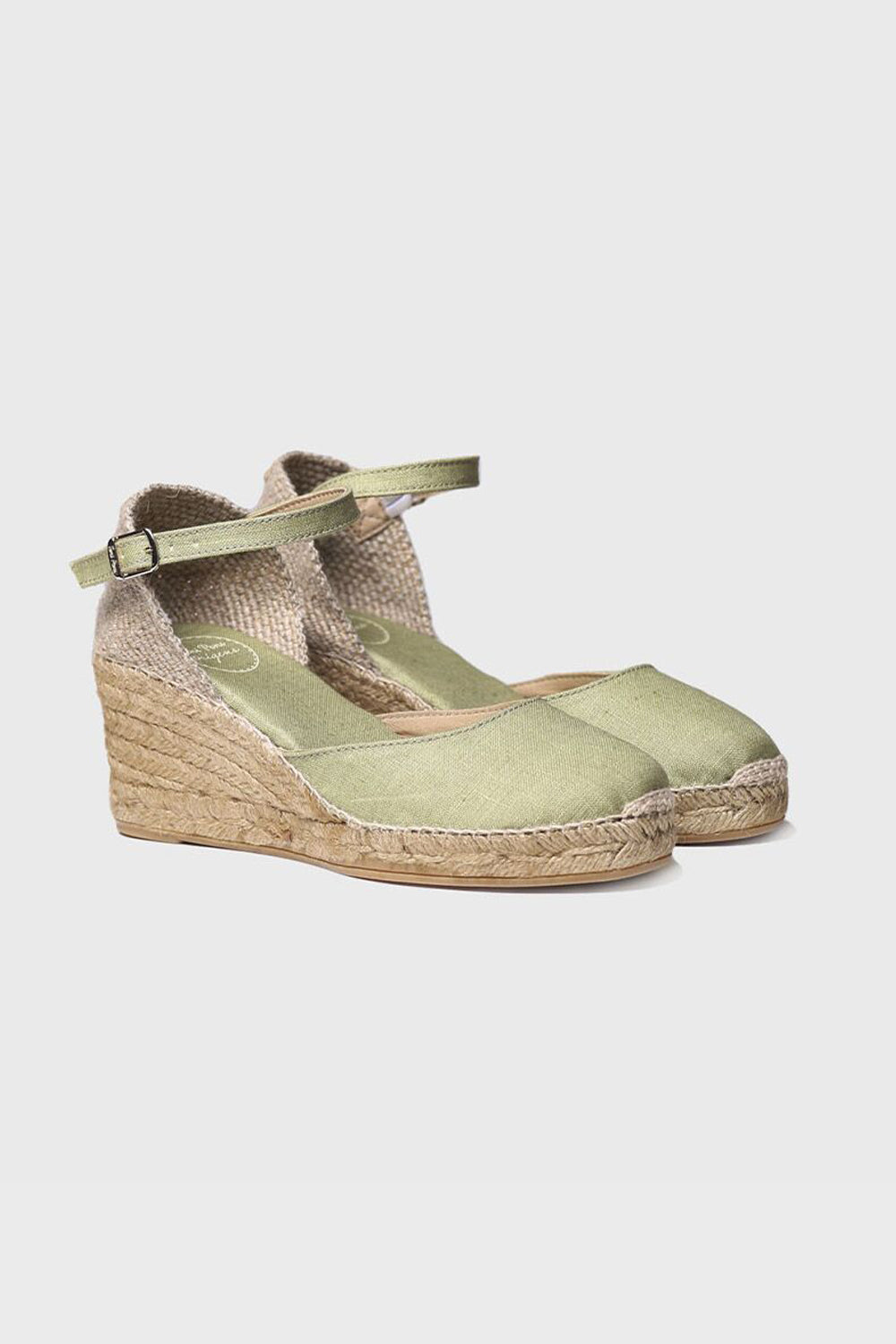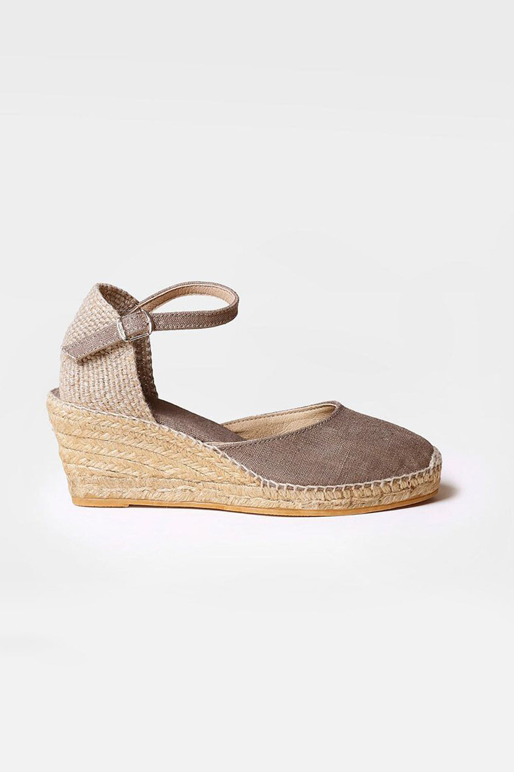 CALDES This wedge espadrille with buckle fastening in plain colours has a total height of 7 cm, of which 5 cm belong to the heel and 2 cm to the platform. The entire wedge is made of jute, and the inner sole is lined with fabric. This design is hand-stitched in Spain. The base of the sole is made of non-slip rubber. This espadrille is 100% vegan, made from materials that do not come from animal origin. This model fits true to size; if you are between two, we recommend choosing the larger size.