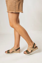 Mixed leather and elastic sandal, with micro sole and jute wedge.
