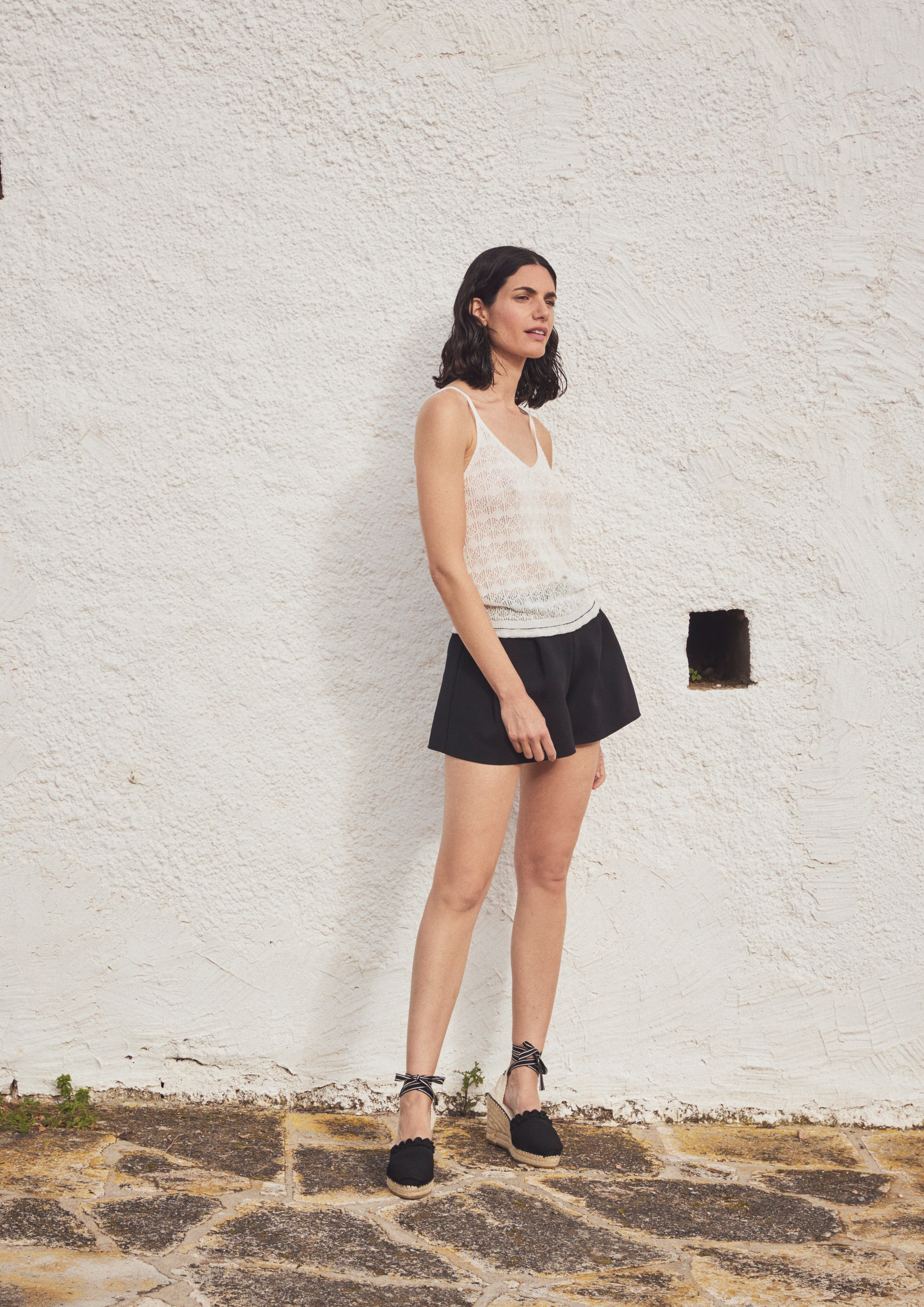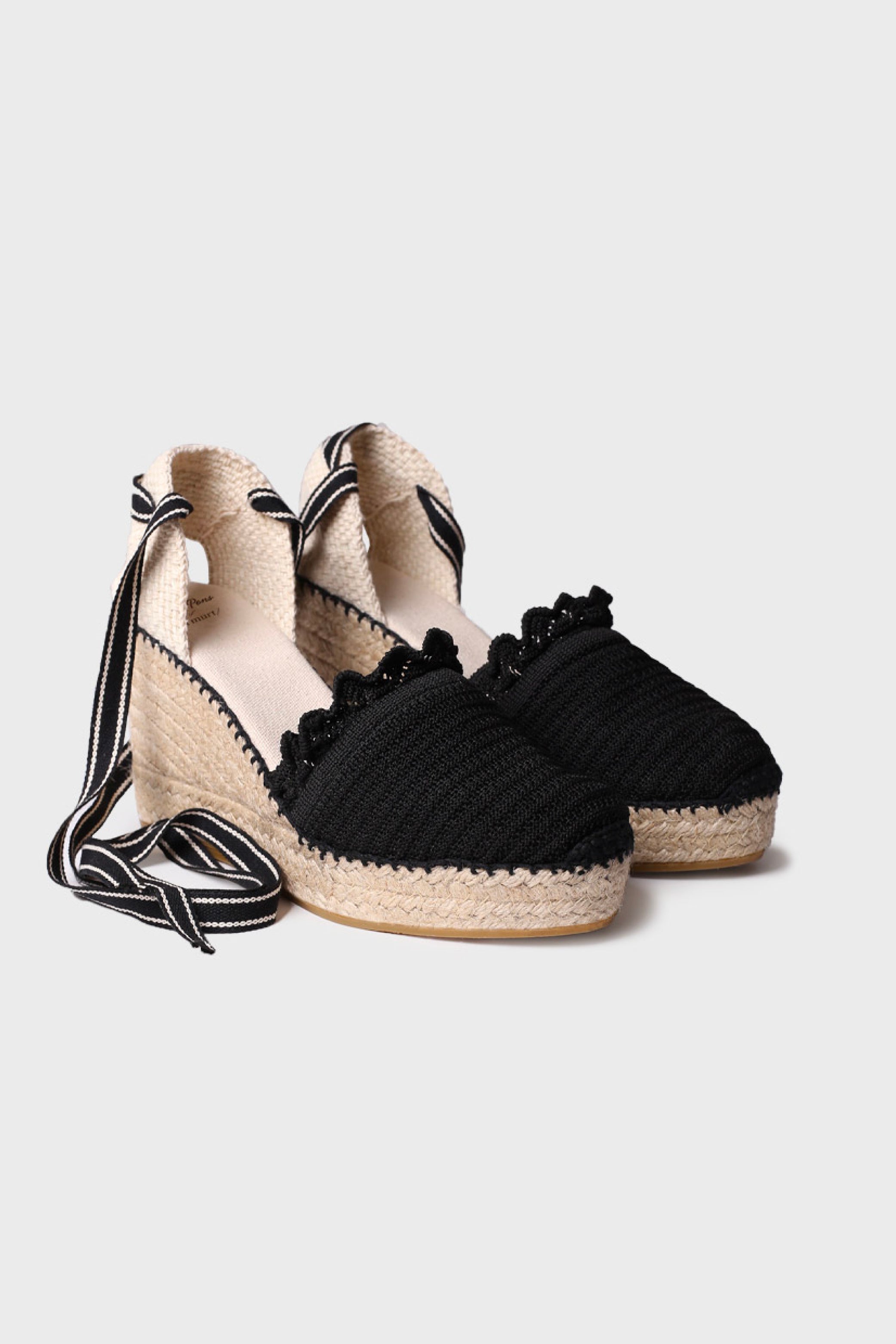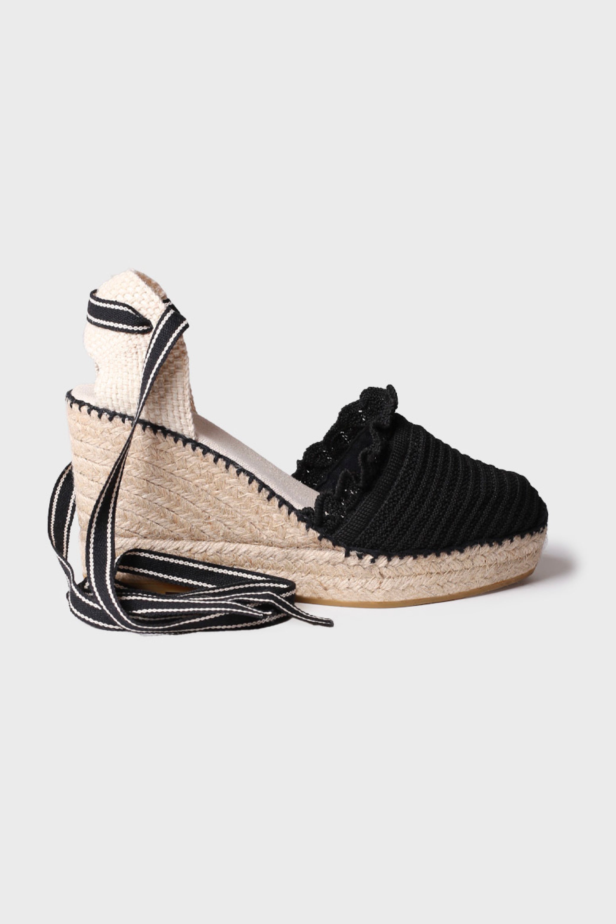 GALARINA. This women’s espadrille with crossed straps is part of the Toni Pons & Sita Murt capsule collection. Made from knit fabric, it includes a padded cotton insole for extra comfort. It is a closed-toe style that adjusts with two-tone ribbons and features a delicate knitted frill on the upper. The jute wedge has a total height of 8.5 cm, with a 5.5 cm heel and a 3 cm platform, offering balance and comfort. The sole is made of non-slip rubber for greater walking stability, and the heel cup is crafted from braided fabric. This design is handcrafted in Spain, with attention to every detail.