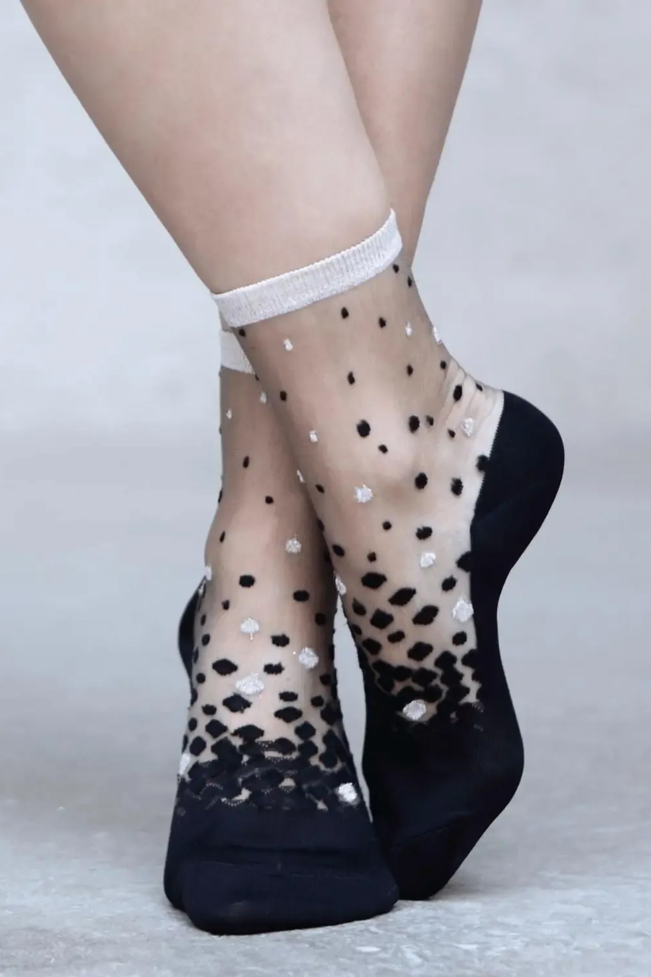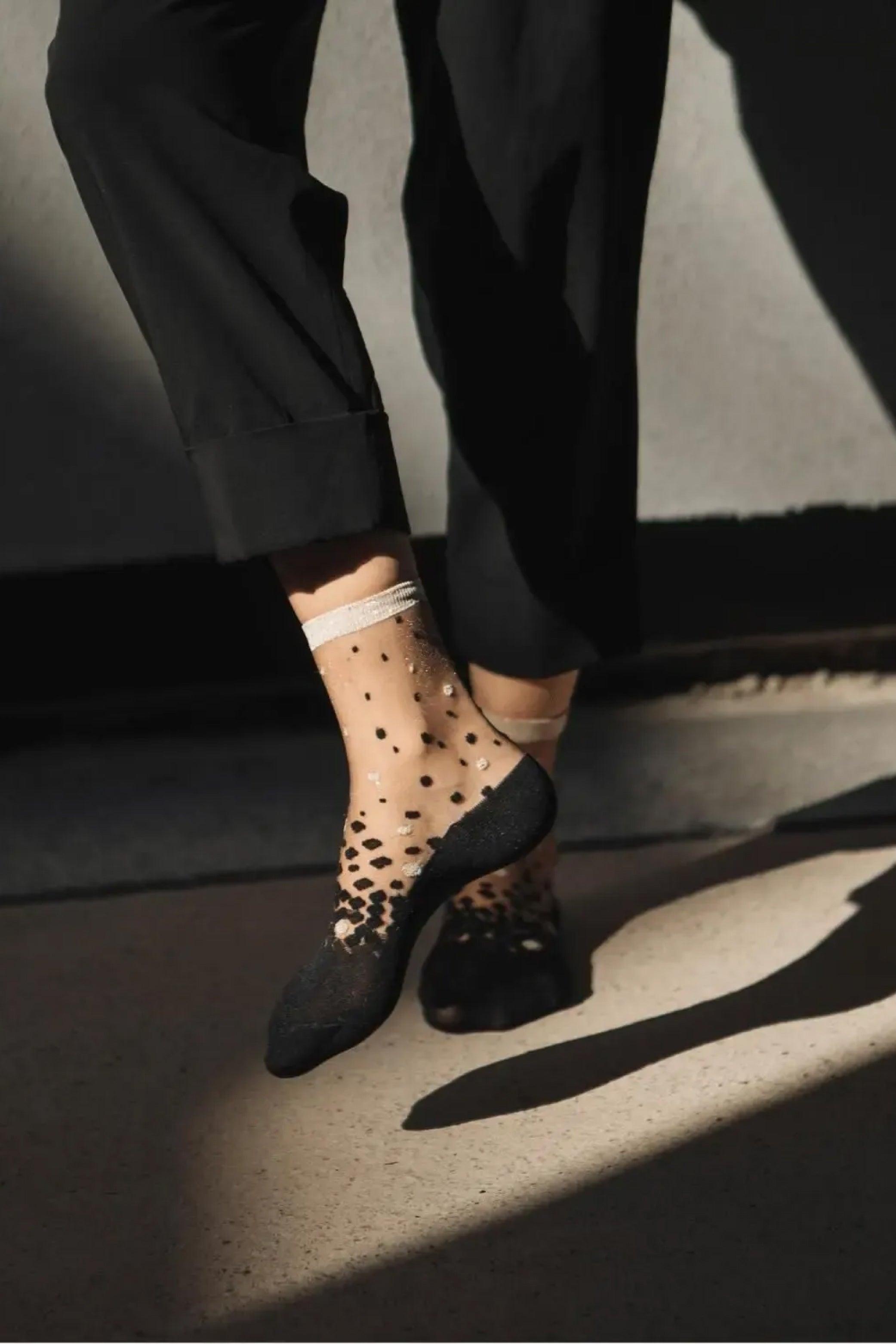 A gradient of black and gold polka dots on a transparent background: a classic plumetis revisited. Perfect with both derbies and loafers! Inspired by the flight of cherry blossom petals on the Nakameguro Canal.