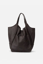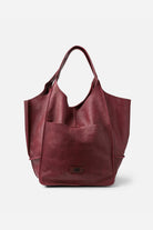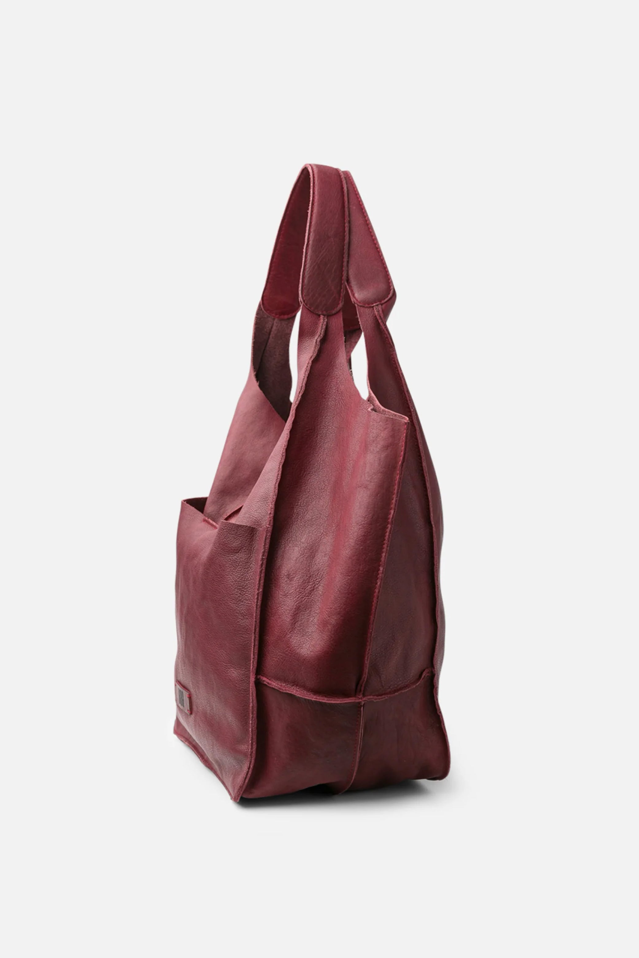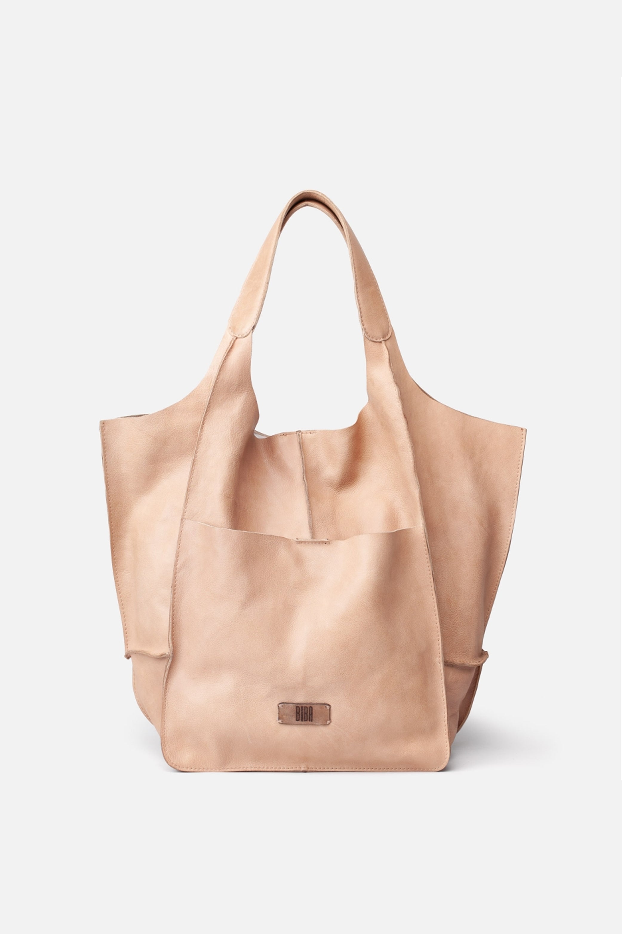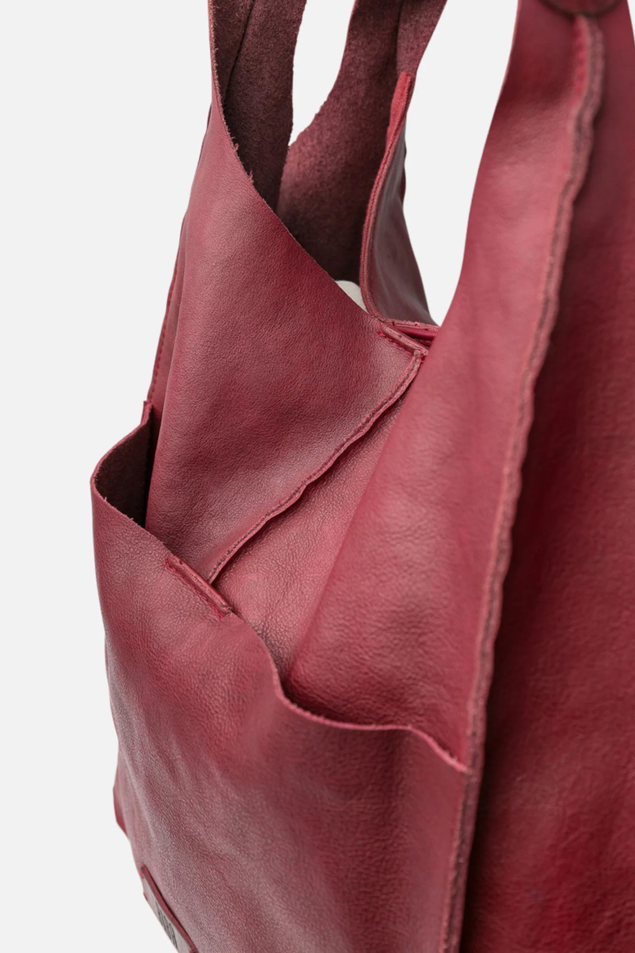 Washed and vegetable-tanned bovine leather shopper. Button closure, external and internal pockets, and no cotton lining.