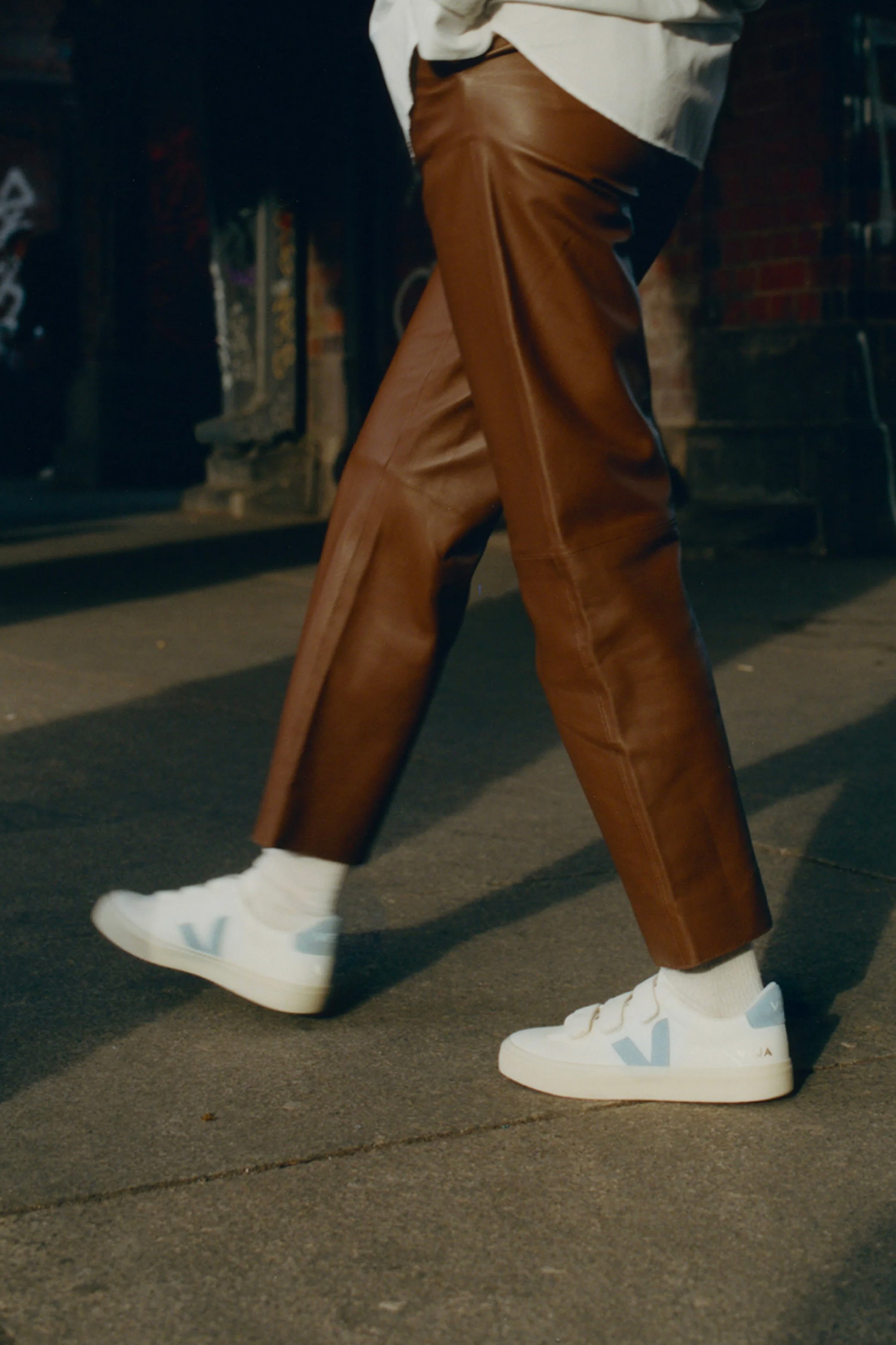 O.T. Leather (Organic Traced) comes from 100% certified organic farms in Uruguay, a country known for its livestock farming culture and high-quality leather. This is our softest and thinnest leather. It is mechanically treated to gain suppleness and finesse, then tanned in Brazil using fewer dyes than conventional leather. VEJA uses dyes that comply with regulations and ensures responsible water use during the tanning process.