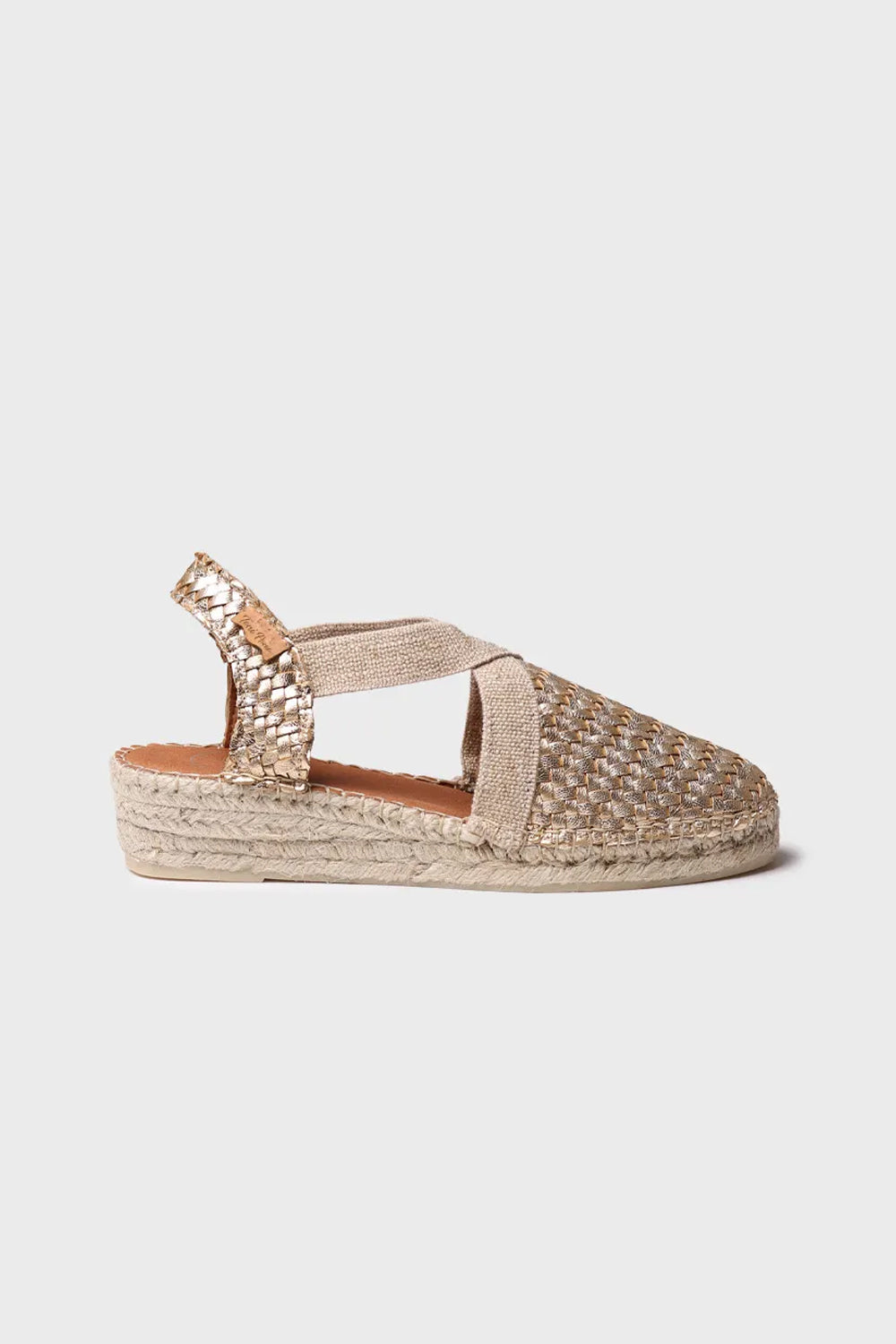 SIRACUSA This closed espadrille with a wedge is made of braided leather. The jute wedge has a total height of 3 cm. The sole base is made of non-slip rubber. The inner insole is lined with padded fabric, providing great comfort. It features two elastic straps crossed over the instep for proper fixation. It is a hand-stitched design made in Spain.